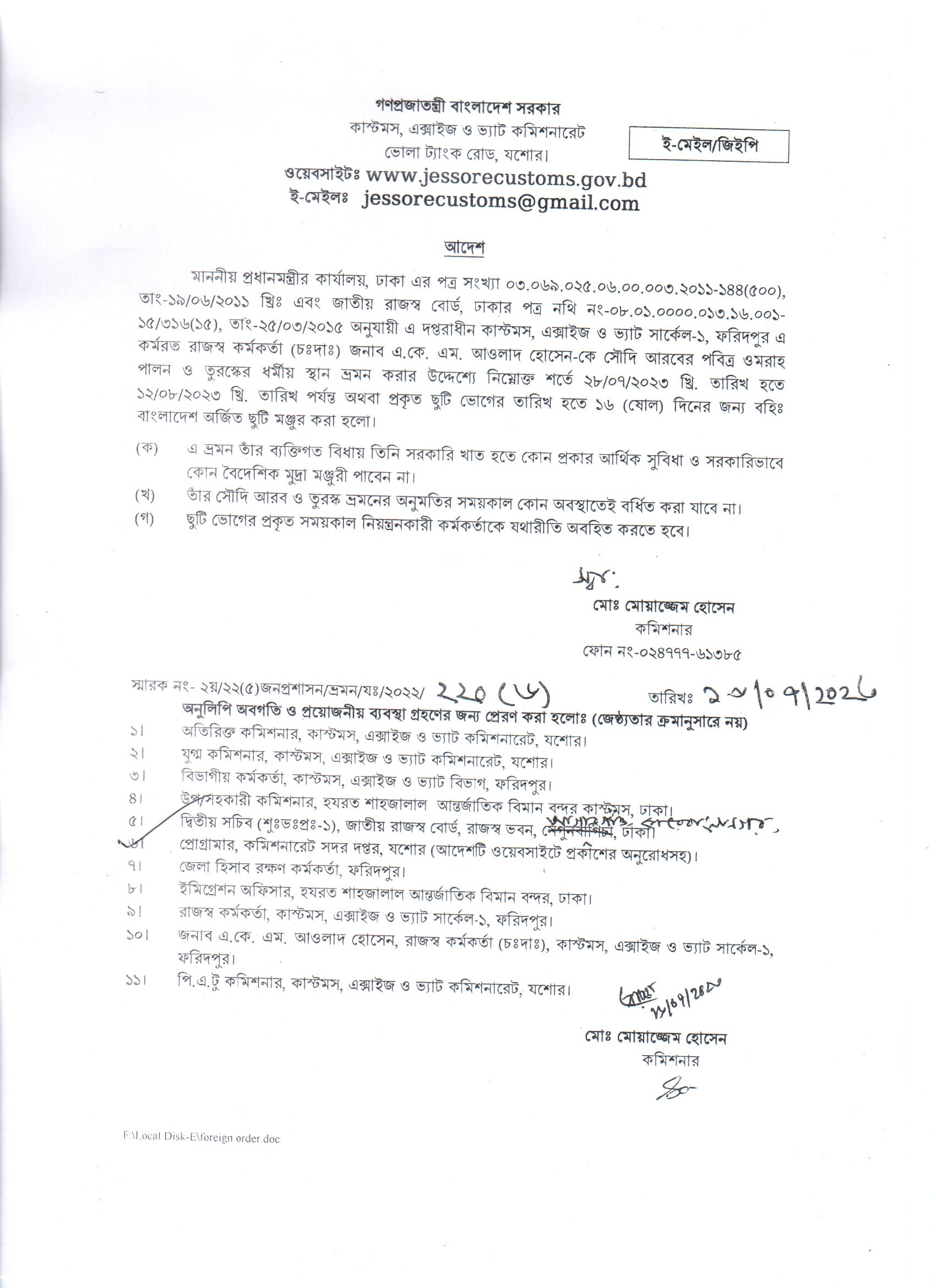 জনাব আবুল কালাম আজাদ, সহকারী রাজস্ব কর্মকর্ত এর বহিঃ বাংলাদেশ ছুটি |